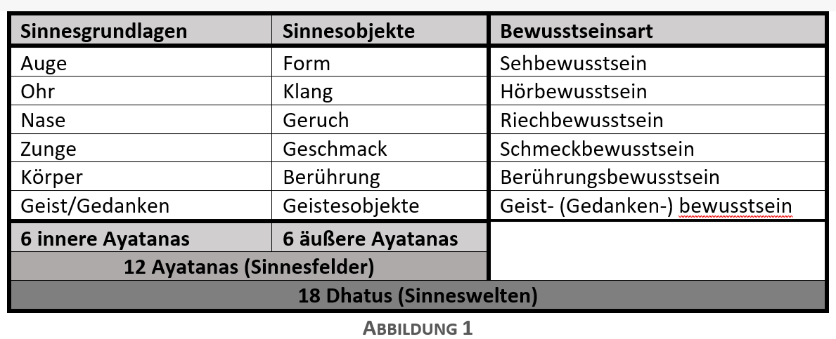 Diese drei Merkmale gelten also für alle Phänomene (Dharma). Das Wort Dharma kann die Lehre Buddhas oder Phänomene bedeuten. Hier ist das Letztere gemeint. Wenn aber die buddhistische Lehre über Phänomene spricht, geht es im engeren Sinn um die Objekte des Gedankenbewusstseins. Um die Buddhalehre korrekt zu verstehen, ist es wichtig, diesen Ausgangspunkt zu verstehen: Es geht in erster Linie nicht um die Erklärung der äußeren Welt, sondern um die Behandlung der inneren Erscheinungen, welche durch den Kontakt der 6 Sinnesgrundlagen mit den 6 Sinnesobjekten entstehen. Daraus entfalten sich die 12 Sinnesfelder (Ayatanas) und 18 Sinneswelten (Dhatus). Diese lassen sich wie folgt grafisch darstellen: