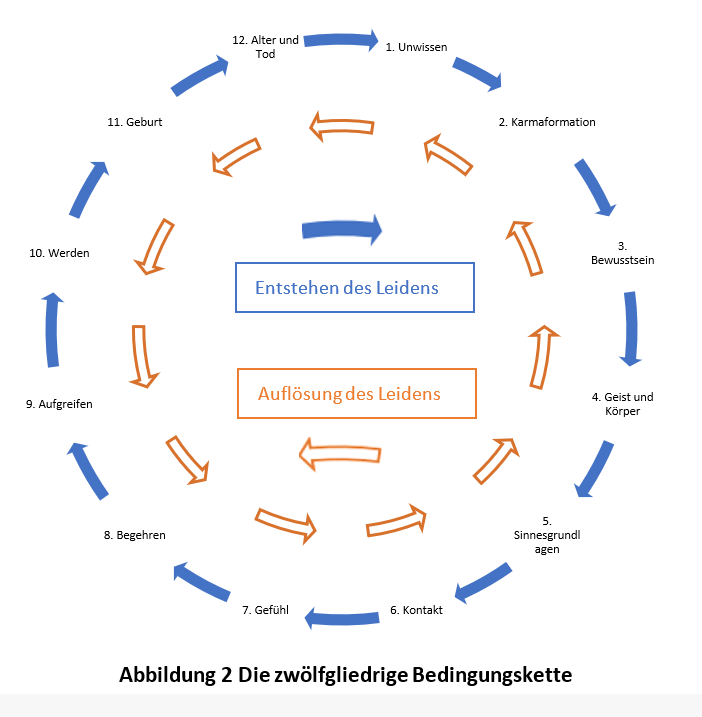 Der buddhistische Grundsatz ist daher, dass alle Phänomene durch Abhängigkeit von Ursachen und Bedingungen entstehen und keine inhärente Natur aufweisen. Dabei geht es nicht darum, die Welt zu erklären, sondern um die Auflösung der Ursache der Entstehung des Leidens/der Unzulänglichkeiten. Wir gehen hier nicht jedes Glied durch. Der Schwerpunkt der Nur-Bewusstsein-Schule liegt beim Bewusstsein. Der Anfang der Bedingungskette ist das Unwissen oder die Verblendung, d. h. ein falsches Wissen oder eine falsche Sicht über die Phänomene bzw. Objekte. Die darauf basierenden Tatabsichten (Karmaformation) beflecken das Bewusstsein. Diese Prägungen bilden die Karma-Samen, welche im Speicherbewusstsein angesammelt werden. Sie transformieren sich bei gegebenen Bedingungen, sprich bei Kontakt mit den Sinnesobjekten, in Szenerien und färben die Sinnesbewusstseine. Das bedeutet das Merkmal der Ursache und Bedingung bzw. der abhängigen, bedingten Entstehung.