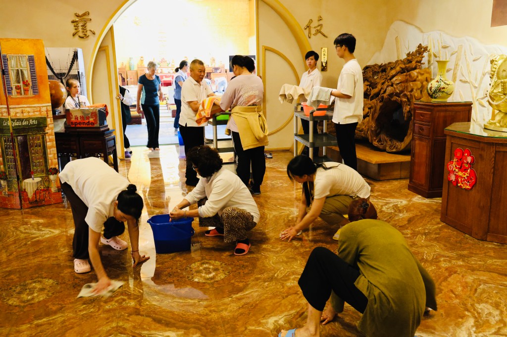 Während die Meditationsübungen den Geist klärten, trug eine kurze Arbeitsmeditation zur Reinigung der Übungsbereiche bei und sorgte für äußere Sauberkeit. Die Teilnehmer widmeten sich dieser „Putzmeditation“ mit Fokus und Gelassenheit. Ehrenamtliche Mitarbeiter sorgten für drei Mahlzeiten täglich. Die Hingabe und Mühe bei der Zubereitung spiegelten sich in der vielfältigen Auswahl der Speisen wider, die bereits einem Festmahl glichen. Auch die Jugendlichen des Tempels halfen bei den alltäglichen Angelegenheiten mit, angeleitet von Judy Lee, die diesmal für die Organisation der alltäglichen Angelegenheiten im Retreat zuständig war.