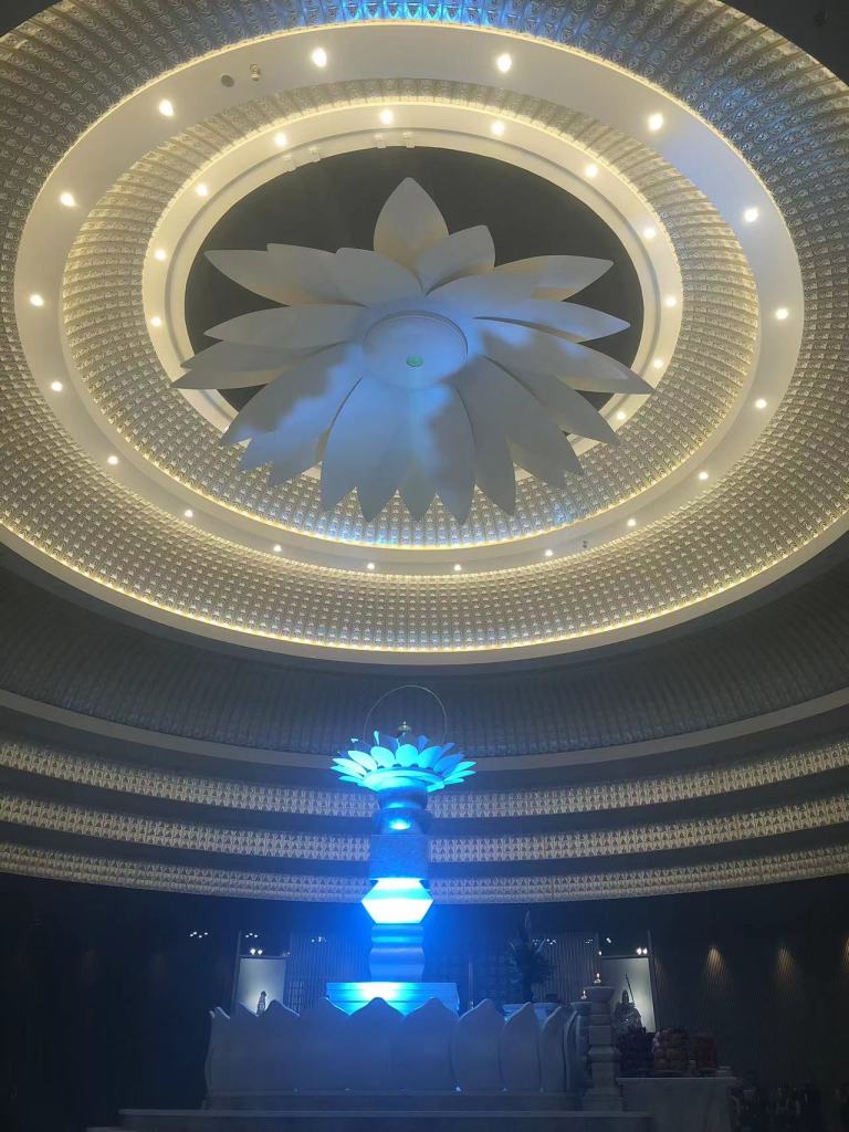„In der Mitte der Decke befindet sich eine nach unten gerichtete Lotusblüte, die im Buddhismus das Symbol für das reine Wesen eines Erwachten darstellt. Die nach unten gerichtete Position symbolisiert, dass die Erwachten, also die Buddhas und Bodhisattvas, zu den weltlichen Wesen kommen und ihnen zur Erlösung verhelfen. Auf dem Schrein sind drei Lichter zu sehen. Zwei stehen auf dem Schreintisch, und eines befindet sich oben über einer Lotusblüte in der Mitte eines goldenen Kreises. Die ersten beiden repräsentieren die polaren Kräfte Yin und Yang, also die energetischen und formhaften Welten. Das letzte Licht steht für das Dao, das höchste Prinzip und die Quelle allen Seins, welches als die Himmlische Mutter bezeichnet wird: