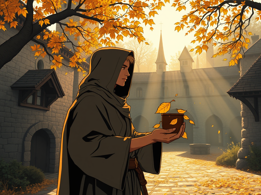 In den stillen Gemäuern eines Klosters, verborgen vor den Augen der Welt, lebte ein junger Mönch, dessen tägliche Pflicht es war, den Hof von den vergänglichen Spuren des Herbstes zu befreien. Jeden Morgen, wenn die Sonne noch zaghaft über den Horizont kroch, erhob er sich und machte sich auf den Weg, den Besen fest in seiner Hand, um die goldgelben Blätter zu bändigen, die der Wind der Zeit von den Armen der Bäume gestohlen hatte.