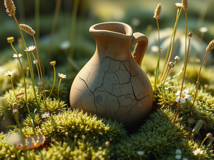 Und als sie aufbrachen, da hob der gesprungene Krug zaghaft seinen Blick. Und siehe! Zu seiner Seite wuchs ein Band von Moos und feinen Gräsern, von zarten Blüten, die nur im Schutz des feuchten Bodens gedeihen. Keine üppige Pracht, kein leuchtendes Farbenmeer – und doch ein stilles, sanftes Leben, das aus dem Boden spross, Tropfen für Tropfen genährt.