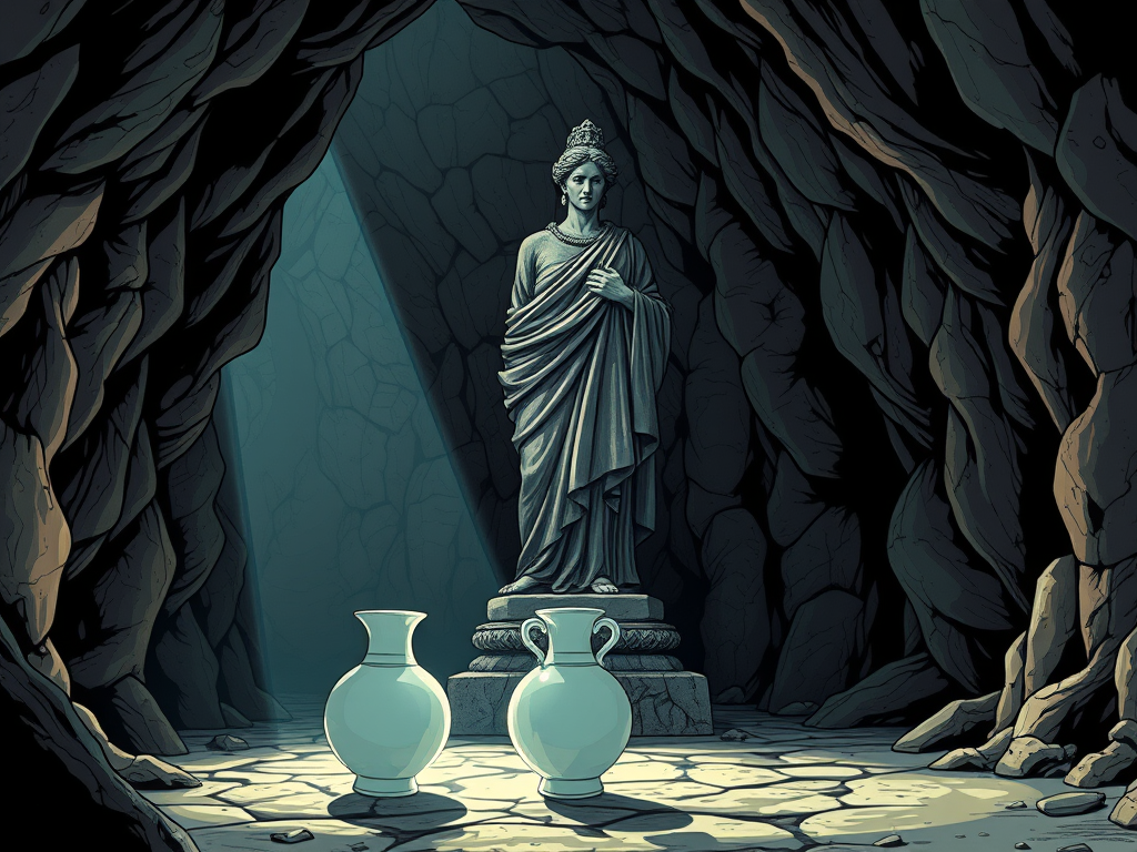 Die Statue antwortete mit ruhiger Stimme: „Eine der Flaschen ist voll mit Essen. Die andere ist leer. Ihr dürft sie nicht anfassen – nur anschauen und euch für eine entscheiden.“