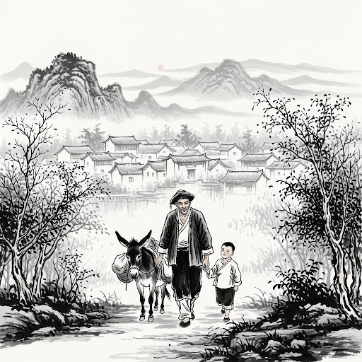 Der Vater hielt inne. Er kratzte sich am Kinn, dann banden sie die Beine des Esels zusammen, legten eine Stange durch und hoben ihn zu zweit auf ihre Schultern. So gingen sie, schwankend unter der Last, über eine schmale Holzbrücke.