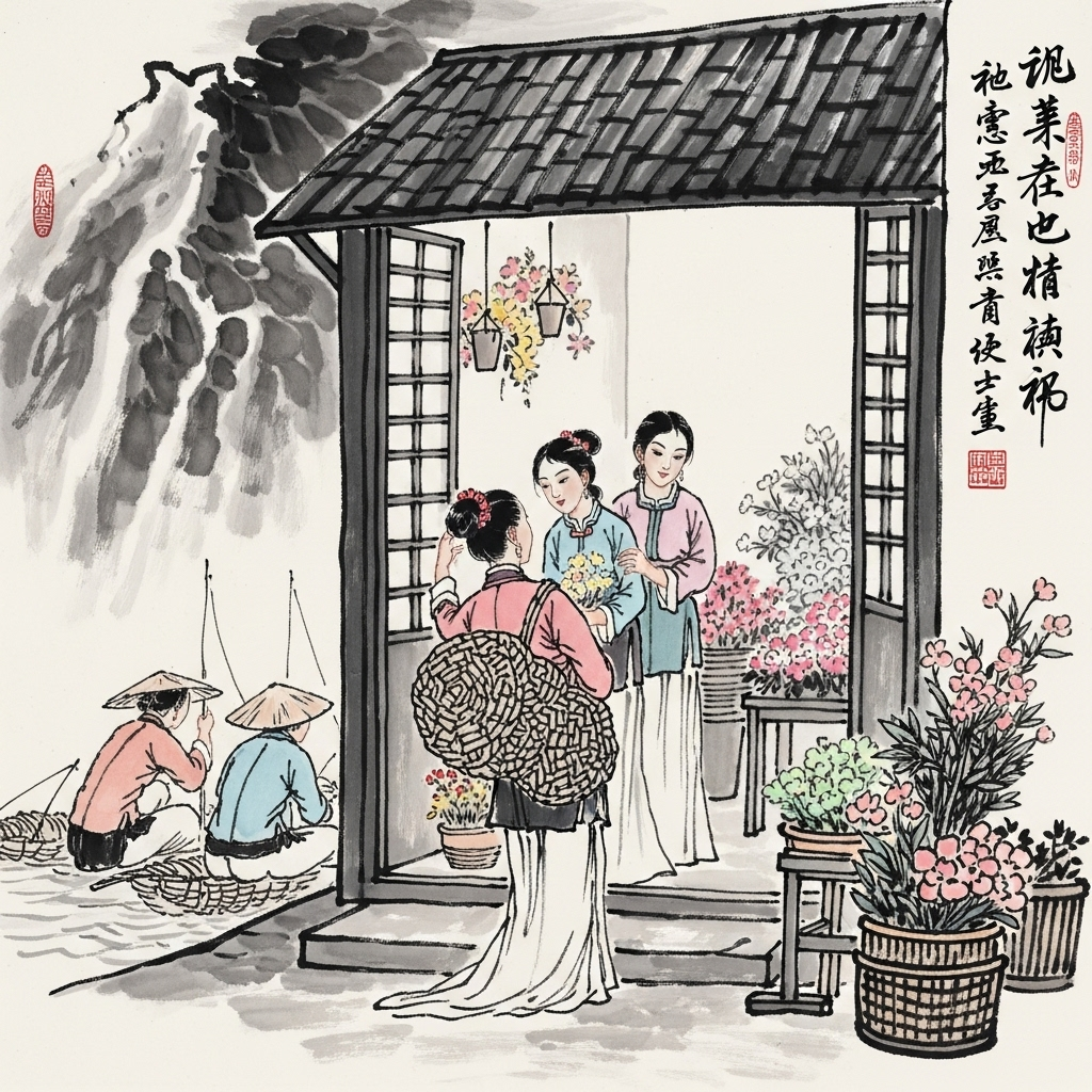 Eine Schar von Fischerfrauen, die gebeugten Rücken unter der Last ihrer leeren Kiepen, schritt in der sinkenden Dämmerung dem heimischen Dorf entgegen. Ihre Glieder waren schwer von der Arbeit des Tages, ihre Haut salzig von der See. Doch noch ehe sie die schützenden Dächer erreichten, brach ein Unwetter von ungestümer Gewalt über sie herein, ein Toben von Wind und Regen, das sie zwang, in einem nahen Blumenladen Zuflucht zu suchen.