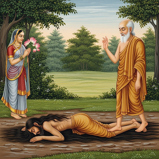 Vor ihm lag ein schlammiges, morastiges Stück Weg, direkt auf der Route des Erhabenen. Niemand wagte sich vor, und der Morast wurde zu einer peinlichen Barriere. Sumedha zögerte nicht: Er löste sein Haarband, und sein langes, schwarzes Haar fiel wie ein Wasserfall herab, bedeckte den schlüpfrigen Boden. Mit seinem Haar als Teppich, seinem Körper als Brücke, schuf er einen reinen Pfad für die Wahrheit, die er im Herzen trug. In diesem Augenblick beugte er nicht nur seinen Körper – er beugte jedes letzte Korn von Ichsucht und Stolz.