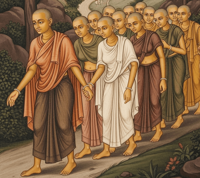 Doch der Buddha unterschätzte die Entschlossenheit dieser Frauen. Ihre Sehnsucht nach dem Dhamma war in Jahren des Wartens und tiefen Lebensfragen gereift. Nach der Ablehnung gab Mahāprajāpatī nicht auf. In einem Akt, der die Welt erschütterte, ließen sie und ihre Begleiterinnen ihre langen Haare – Sinnbild ihrer Schönheit und ihres Standes – abschneiden, legten ihre prächtigen Seidengewänder ab und zogen einfache, orangefarbene Roben an. Barfuß folgten sie dem Buddha auf seinem Weg, Schritt für Schritt, durch Staub und Hitze (Cullavagga X.1.2–4).